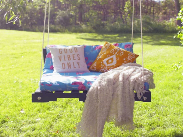 Thay vì mua sắm bên ngoài, bạn có thể tự sáng tạo những tấm gỗ pallet để biến nó trở thành một chiếc xích đu độc đáo. Hãy đặt thêm một vài tấm nệm êm ái để bất cứ thành viên nào trong ngôi nhà cũng có thể thoải mái ngồi đung đưa trên chiếc xích xu tự chế, vui chơi, thưởng trà hay đơn giản ngồi chiêm nghiệm cuộc sống.