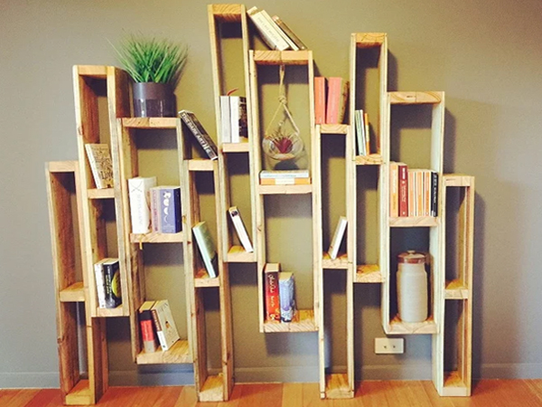 Thiết kế giá sách dọc sử dụng vật liệu gỗ pallet là ý tưởng không tồi cho gia chủ. Những thanh gỗ hình chữ nhật với kích thước khác nhau khi ghép lại tạo nên vật dụng hữu ích và sinh động cho không gian sống. Với mẫu giá sách từ gỗ pallet, gia chủ không chỉ chứa sách, đồ lưu niệm và chậu cây xanh để mang tới nét mộc mạc, đơn sơ nhưng không kém phần tinh tế.