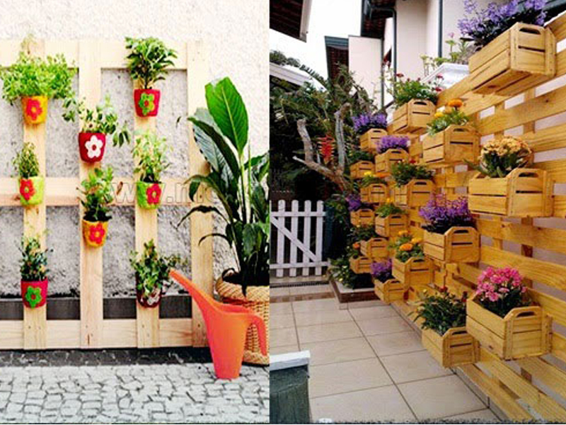 Bản thân kẽ hở giữa các thanh gỗ trong pallet cũng hoàn toàn lý tưởng để Qúy khách treo lên đó những chậu cây, chậu hoa. Qúy khách thấy đấy, như trong bức tranh này thì chỉ vài tấm pallet gỗ, ít chai nhựa và chút khéo tay là Qúy khách đã có ngay một khu vườn treo đẹp mắt.