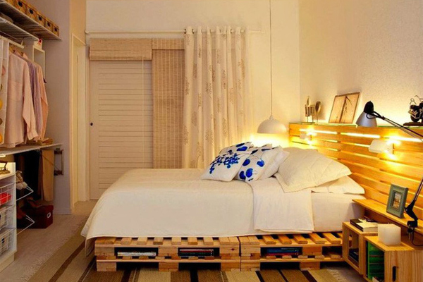Một điểm cộng nữa của giường pallet là bạn có thể tận dụng các khe hở của pallet để lưu trữ đồ đạc.