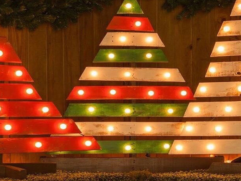 Một trong những biểu tượng của mùa Giáng sinh chính là cây thông Noel, thay vì phải đi mua, bạn có thể tự tay tạo ra những cây thông bằng pallet gỗ. Nó sẽ mang đến bầu không khí vô cùng ấm cúng và tươi mới, hững thanh gỗ sẽ được cắt vát thành hình thang.